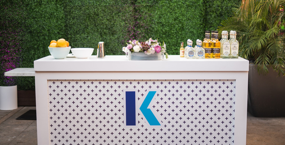 Our client asked for their brand to be represented at the reception without putting their logo everywhere, and wanted to subtly portray the idea of being 'better together,' so we utilized their corporate colors and a + sign to make their vision come to life! We added a lot of custom touches at this event, from the + sign wrapped bars and matching pillows, to the cocktail napkins, staff t-shirts, floor decals & more! We blocked off what is usually a completely open patio by lining the perimeter with hedge walls, then topped it off with modern lounge furniture, beautiful florals + purple uplighting throughout the venue, and it completely transformed the space!